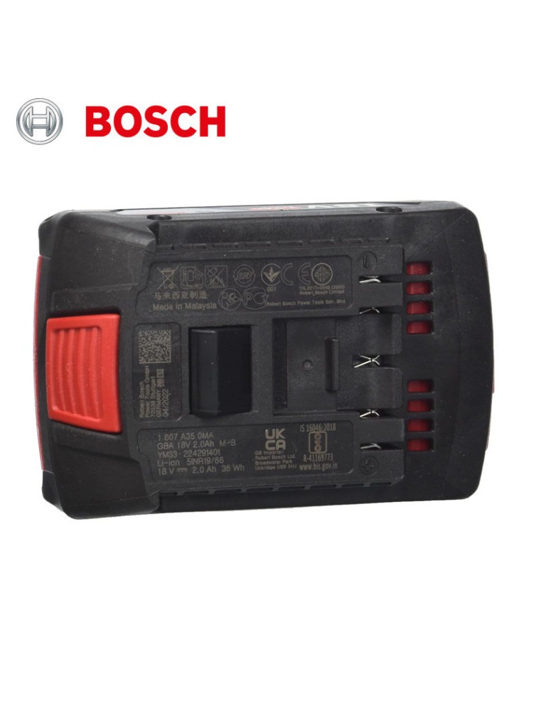 Tension nominale : 18 V – Capacité : 2 Ah (36 Wh) – Dimensions : approx 75 × 113 × 39 mm .
