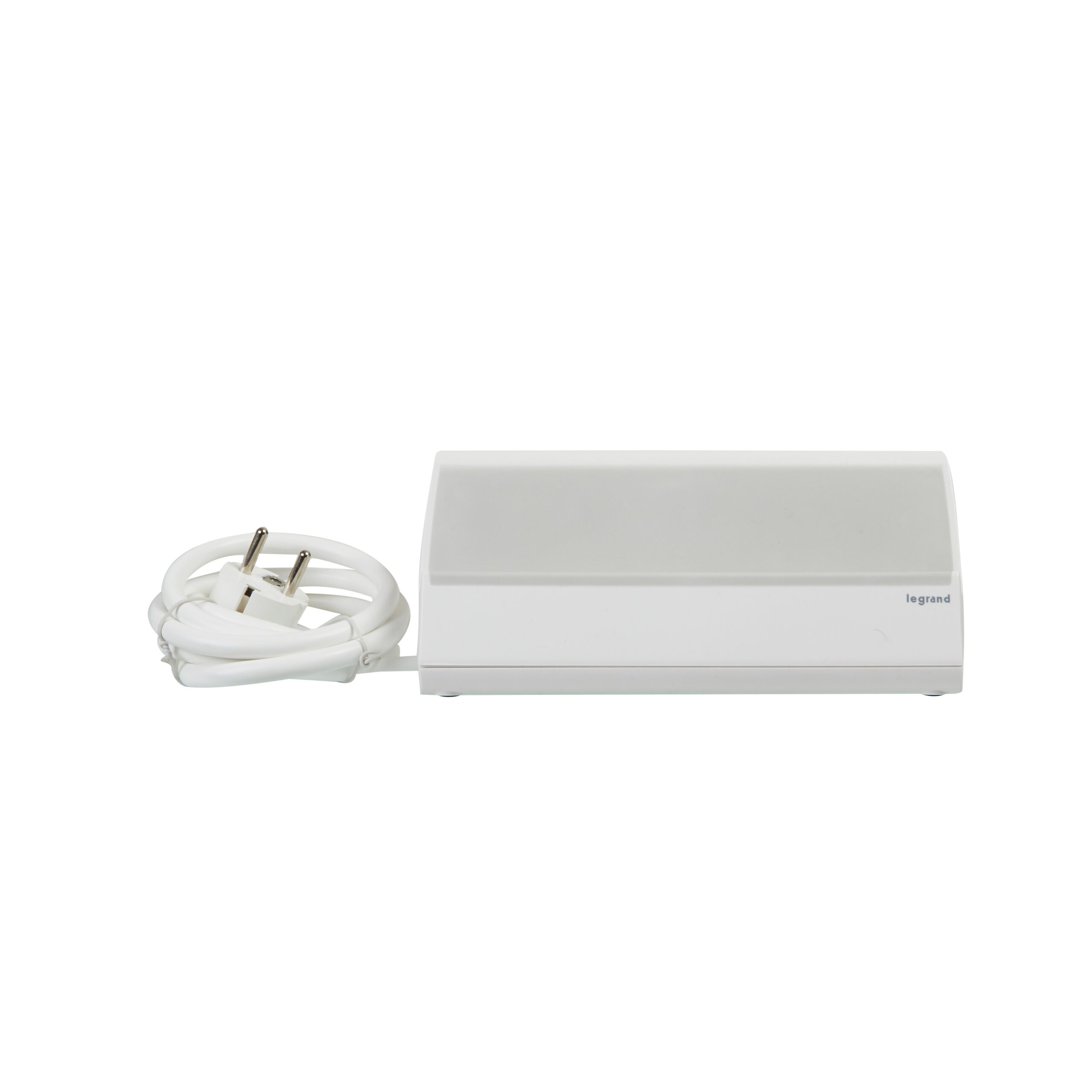 Multiprise avec support tablette caoutchouc. 2 ports USB. Interrupteur lumineux. Protection contre les surcharges. Finition blanc et gris.Cordon PVC blanc.