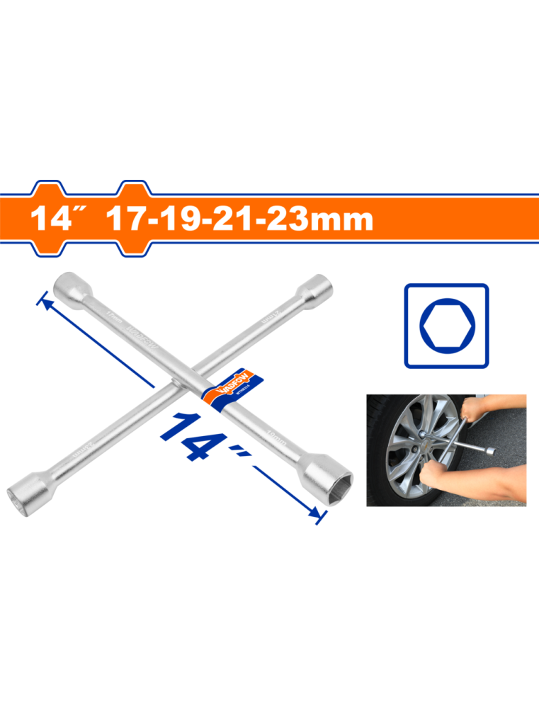 Longueur : 14 pouces (~35,5 cm) – Dimensions des douilles : 17 mm, 19 mm, 21 mm, 23 mm – Matériau : Acier au carbone CK45 – Design : Forme en croix.