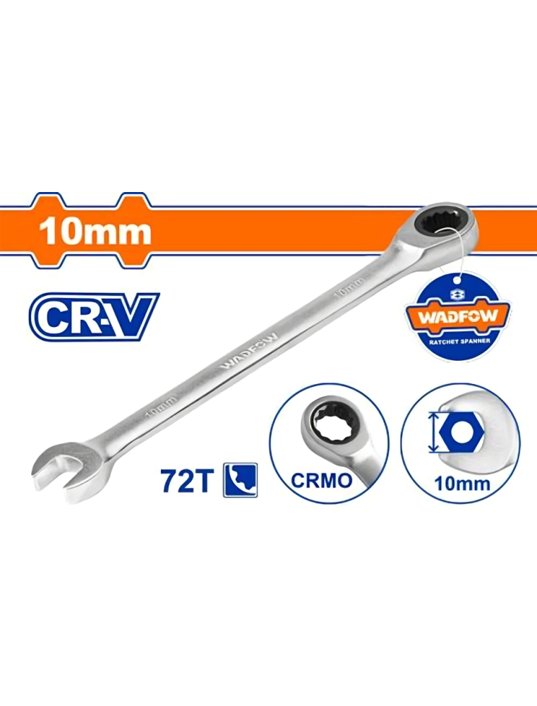 Taille : 10 mm standard – Longueur totale: environ 160 mm – Type : Clé mixte – Corps: acier Chrome‑Vanadium (Cr‑V) – Finition : chromée satinée mate.