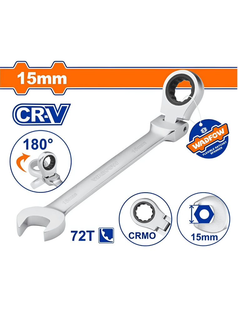 Type : Clé mixte – Taille : 15 mm – Corps: acier Cr‑V forgé – Finition : chromée mate – Tête: pivotante 180°.