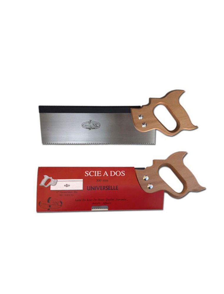 Sciage de divers travaux de menuiserie – Découpage de staffe – Acier poli blanc – Dos renforcé – Denture universelle fine avoyée affûtée – Poignée en bois hêtre – Étuis en carton .